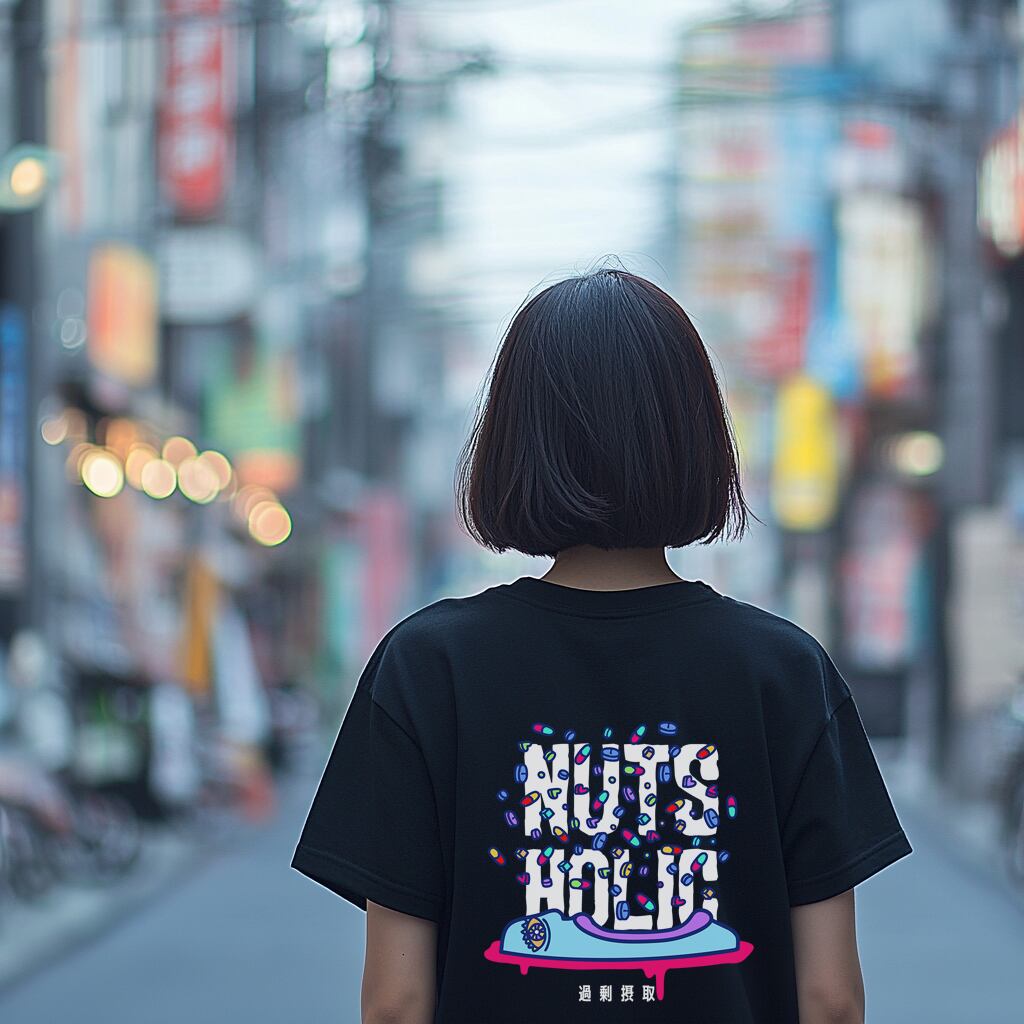iiANBYの「iiANBY_NUTSHOLIC Black」です。深みのあるブラックに映えるコンテンポラリーデザインで、スタイリッシュな印象を与えます。カタチ、厚さ、着心地が人気のUnited Athle9.0オンスTシャツ生地を使用しており、透け感がなく、オーバーサイズでリラックスしたシルエットを楽しめます。